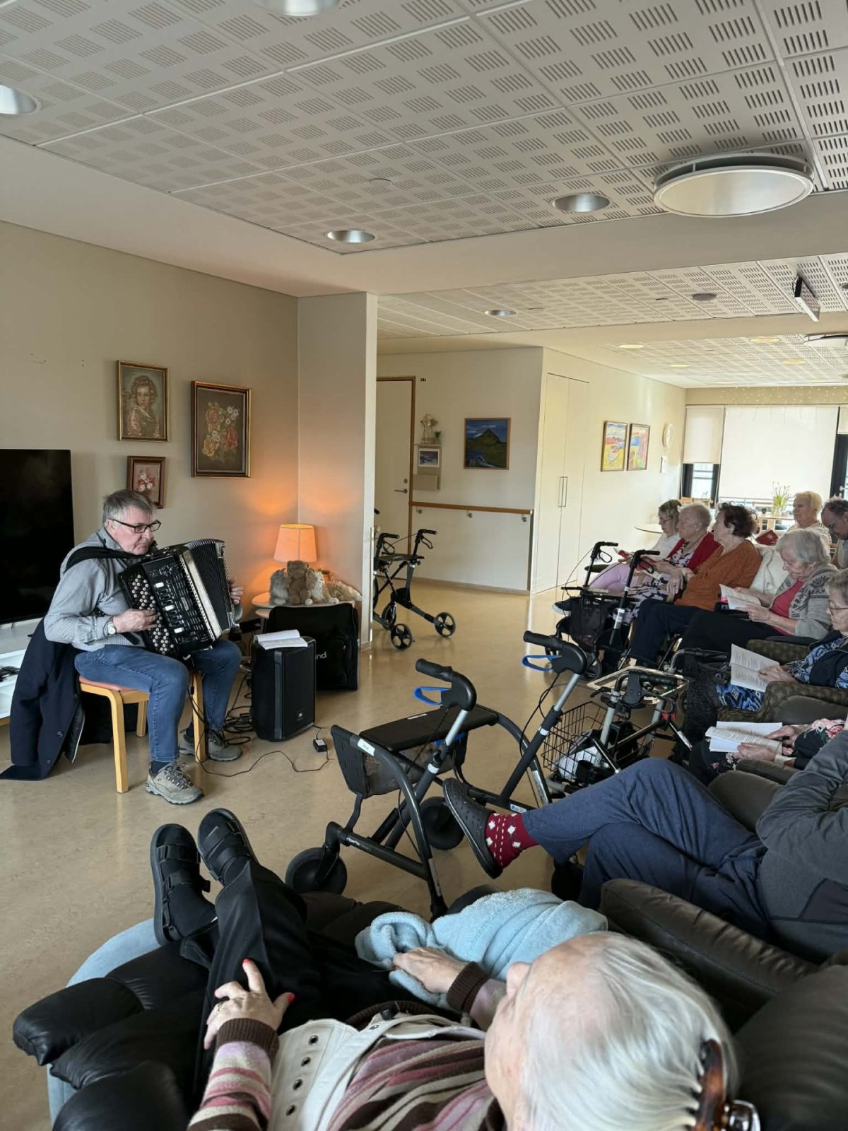 Við erum svo heppin í Mörk að fá reglulega í heimsókn sjálfboðaliða frá Rauða krossinum. Einn þeirra er Steinar Frímannsson harmonikkuleikari. Hann gleður heimilisfólkið vikulega, spilar iðulega lög sem allir þekkja og úr verða notalegar söngstundir.
