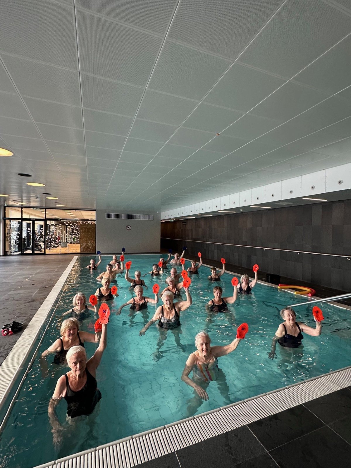 Tuttugu og tveir íbúar mættir í sundlaugina í vatnsleikfimi og gleðin við völd.