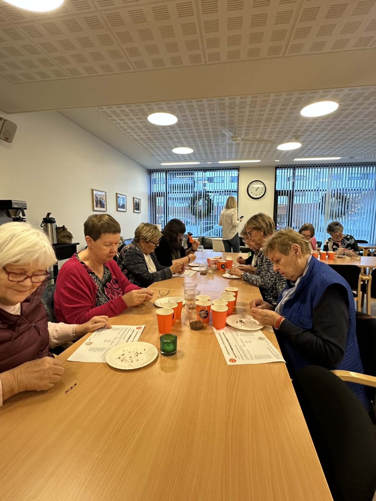 Í gær hittust konur sem búa hjá Íbúðum 60+ í Mörk og perluðu saman armbönd til styrktar Krafti, sem er félag ungs fólks sem hefur greinst með krabbamein.